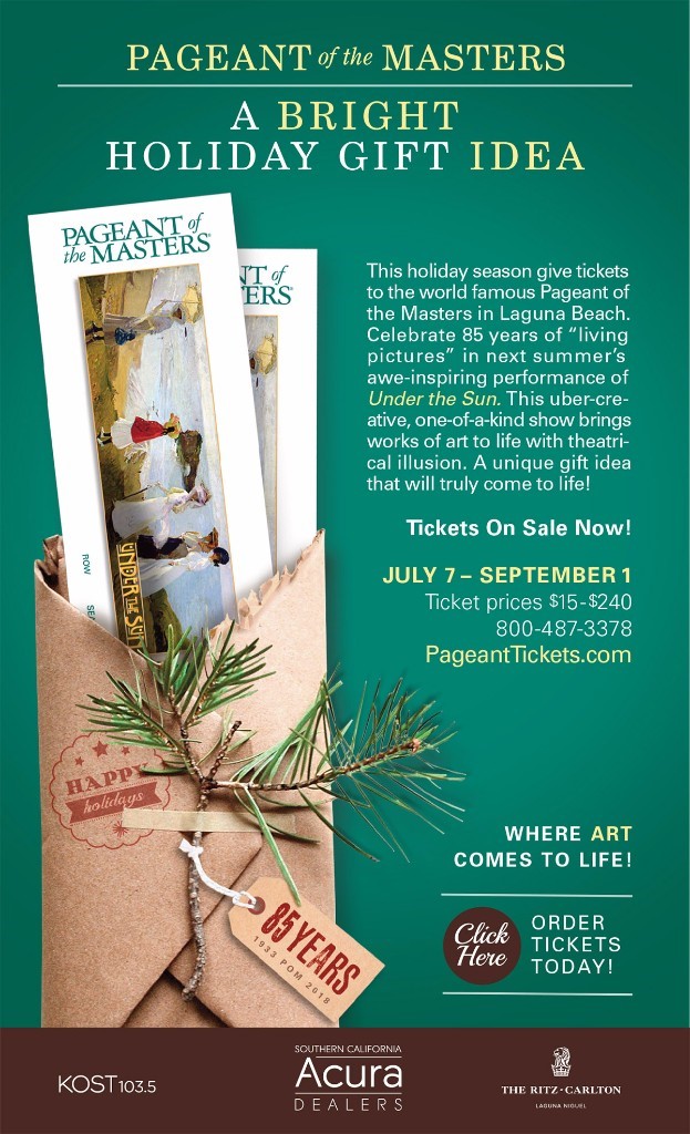 Tickets for the much-anticipated 2018 Pageant of the Masters are on sale now and make the perfect holiday gift for art lovers. Brighten up the holiday season with tickets to next summer’s production “Under the Sun.”