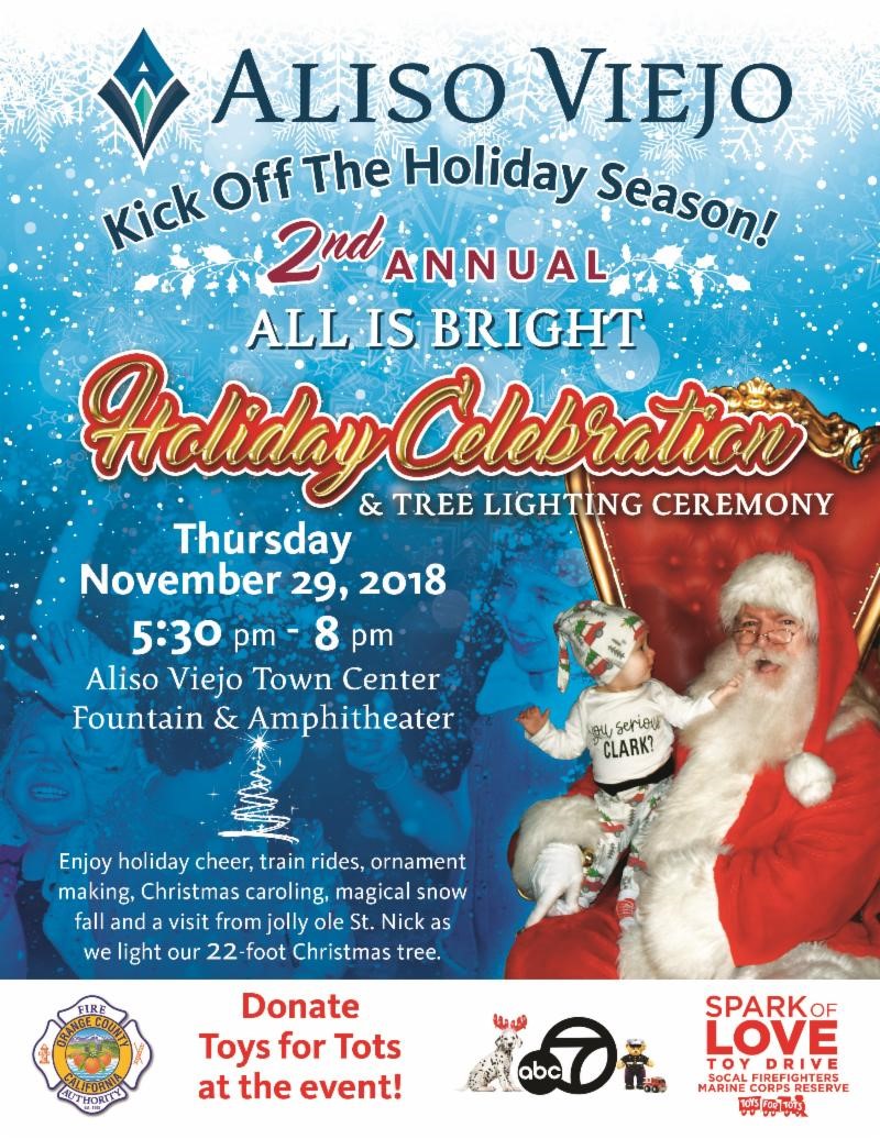 Save the date for November 29 when Santa and snowfall return to Aliso Viejo during our 2nd annual All is Bright Holiday Celebration and Tree Lighting Ceremony! Help us usher in the holiday season from 5:30-8 p.m. at the Aliso Viejo Town Center fountain and Amphitheater.