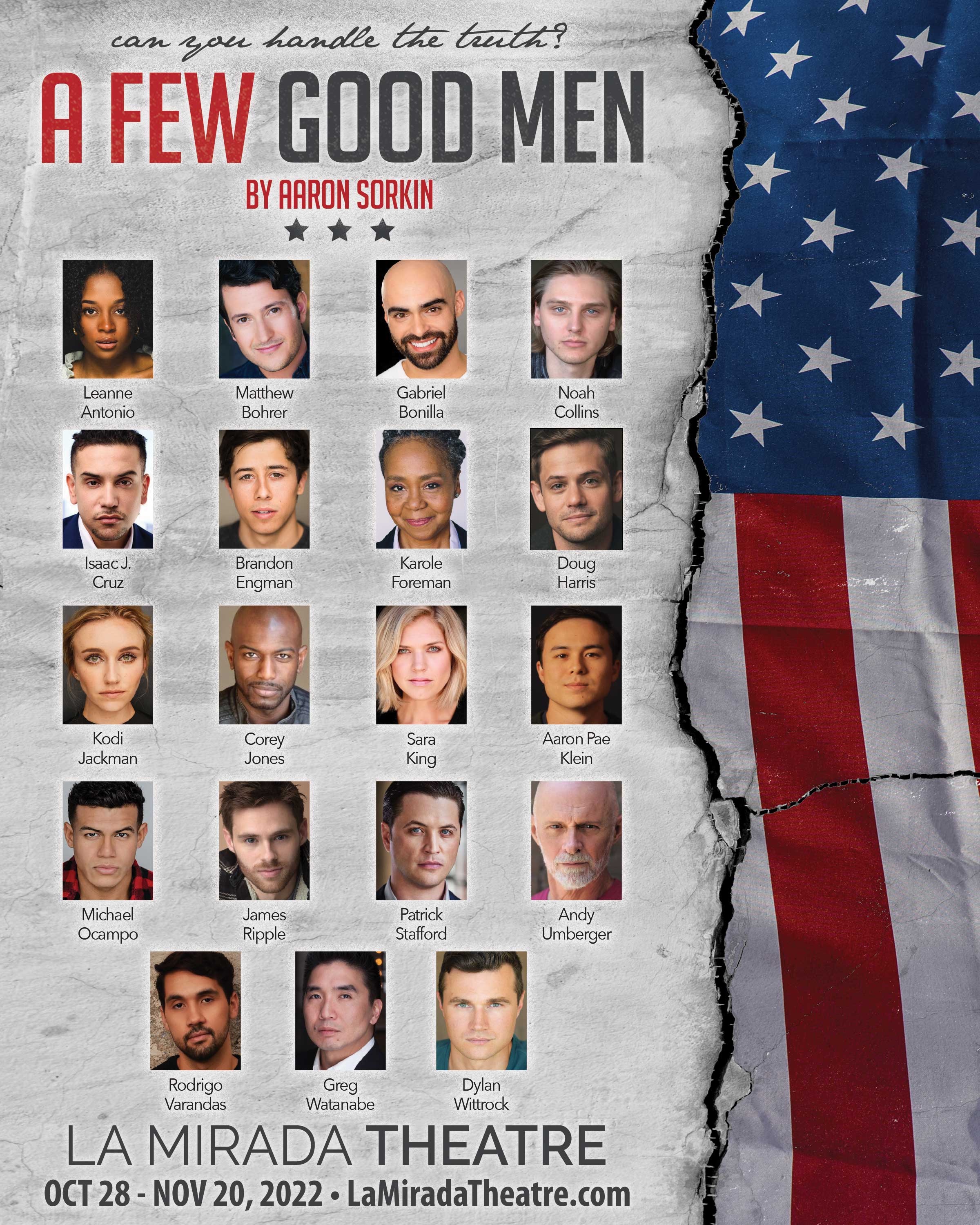 LA MIRADA THEATRE FOR THE PERFORMING ARTS & McCOY RIGBY ENTERTAINMENT are thrilled to announce the cast for the second show of their 2022-2023 season, the rarely produced and widely acclaimed military masterpiece A FEW GOOD MEN, written by Aaron Sorkin and directed by Casey Stangl. A FEW GOOD MEN will preview on Friday, October 28 at 8 pm & Saturday, October 29 at 2 pm (with a press opening on Saturday, October 29 at 8 pm) and will run through Sunday, November 20, 2022 at La Mirada Theatre for the Performing Arts, 14900 La Mirada Blvd in La Mirada.