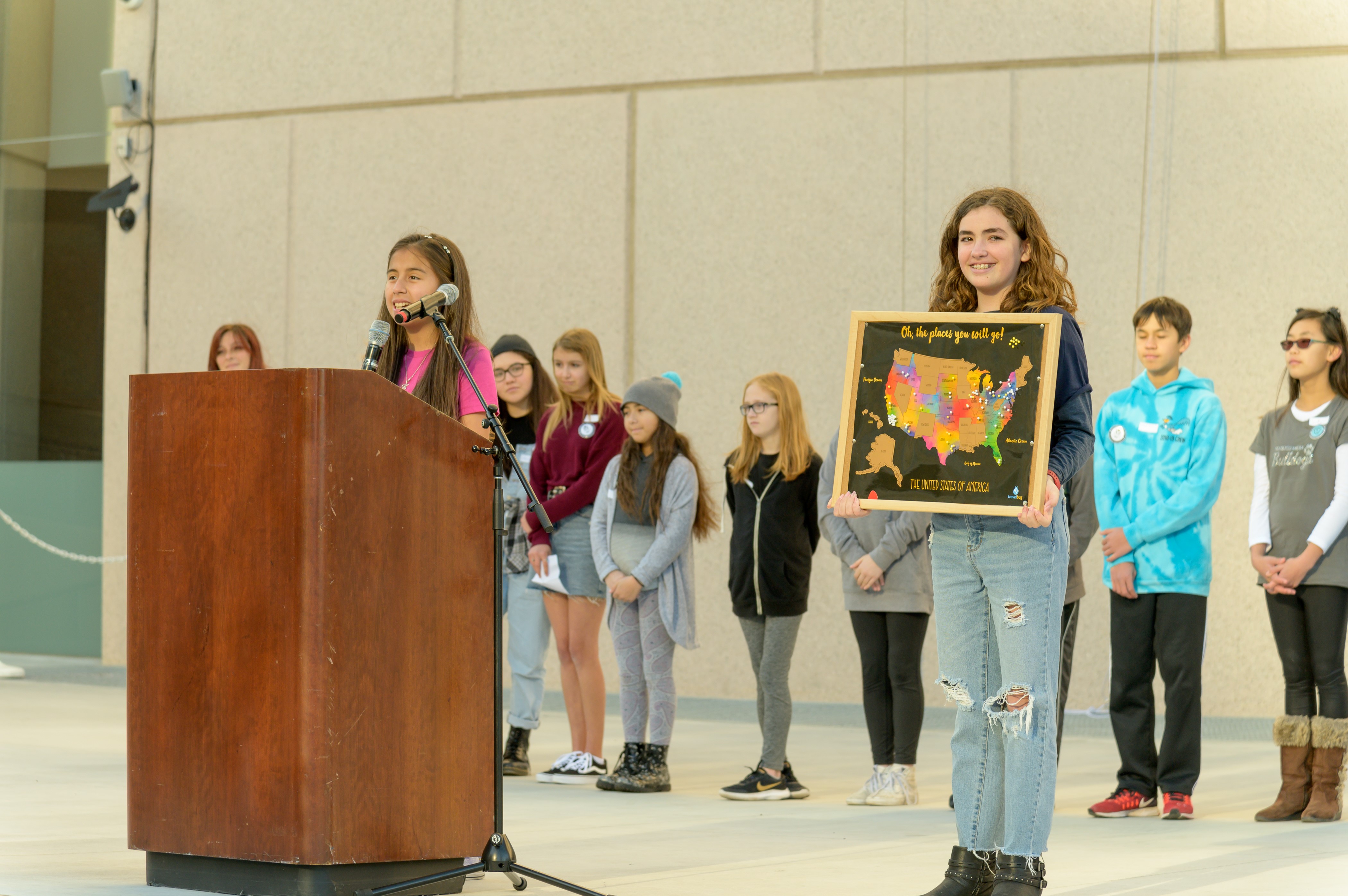 Trabuco Mesa Elementary School SAKtivists (Student Acts of Kindness) were thrilled to be invited to speak at “We All Have Stories – Kindness” at the Segerstrom Center for the Arts free community event on the Julianne and George Argyros Plaza this past Saturday, February 16.  They thought that they’d be sharing their stories and encouraging others to join in the movement of making a difference, one simple act of kindness at a time.