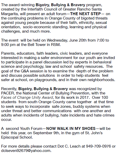 HealthNews Bigotry, Bullying and Bravery: The Next Step Informational Forum By: Susan Keysor Espenschied Date: June 15, 2018 Previous articleSegerstrom Center for the Arts Presents NATALIA OSIPOVA in the World Premiere of ISADORANext articleSummer Concert – Aeromyth (Aerosmith Tribute Band) Susan Keysor Espenschiedhttps://alisolagunanews.whatisyourverse.com Look! Drink, Mommy! Marketing Help Free Bible Local Sponsors Popular Volunteers Help Bring Award-Winning Elks U.S.A. Float to Life at the 2026 Rose Parade Elks Lodge #2444 Celebrates 20 Years of Giving Dictionaries to Local Students Low-Cost Pet Vaccination Clinics Mission Viejo–Saddleback Valley Elks Lodge #2444 Welcomes New Members EISENHOWER: THIS PIECE OF GROUND – LAGUNA PLAYHOUSE More like thisRelated Volunteers Help Bring Award-Winning Elks U.S.A. Float to Life at the 2026 Rose Parade Editor - January 12, 2026 By Jenny Buford The beauty and brilliance of the Elks... Elks Lodge #2444 Celebrates 20 Years of Giving Dictionaries to Local Students Editor - January 8, 2026 The Mission Viejo–Saddleback Valley Elks Lodge #2444 proudly announces... Low-Cost Pet Vaccination Clinics Editor - January 5, 2026 RSM Low-Cost Pet Vaccination Clinic scheduled for Tuesday, January... Mission Viejo–Saddleback Valley Elks Lodge #2444 Welcomes New Members Editor - January 5, 2026 The Mission Viejo–Saddleback Valley Elks Lodge #2444 recently welcomed...