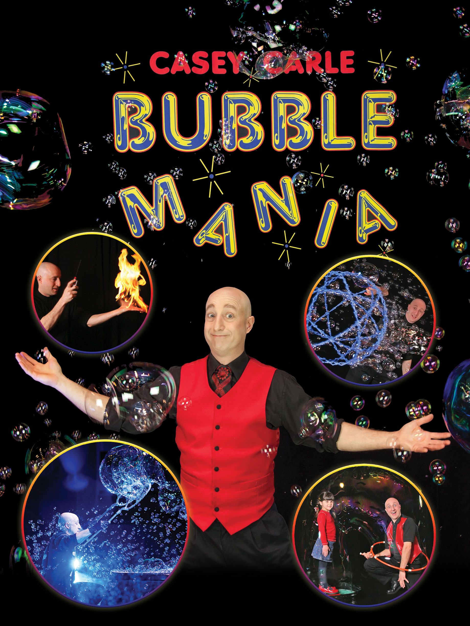 Carle, who is a cum laude graduate of the State University of New York at Geneseo, began his effervescent bubbly career as a clown in the Ringling Bros. and Barnum & Bailey Circus. There, he became the first circus entertainer in the country to encase a person in a bubble. Since then, he has parlayed his comedic timing, showmanship, science know-how and bubble-making expertise into a show that has garnered broad critical praise. The Boston Globe said, “Carle creates ephemeral masterpieces out of thin soap. Behind the act is a wealth of training and a passion for this slippery art form,” while the Norwich Bulletin called Carle’s BubbleMania “screamingly funny.”