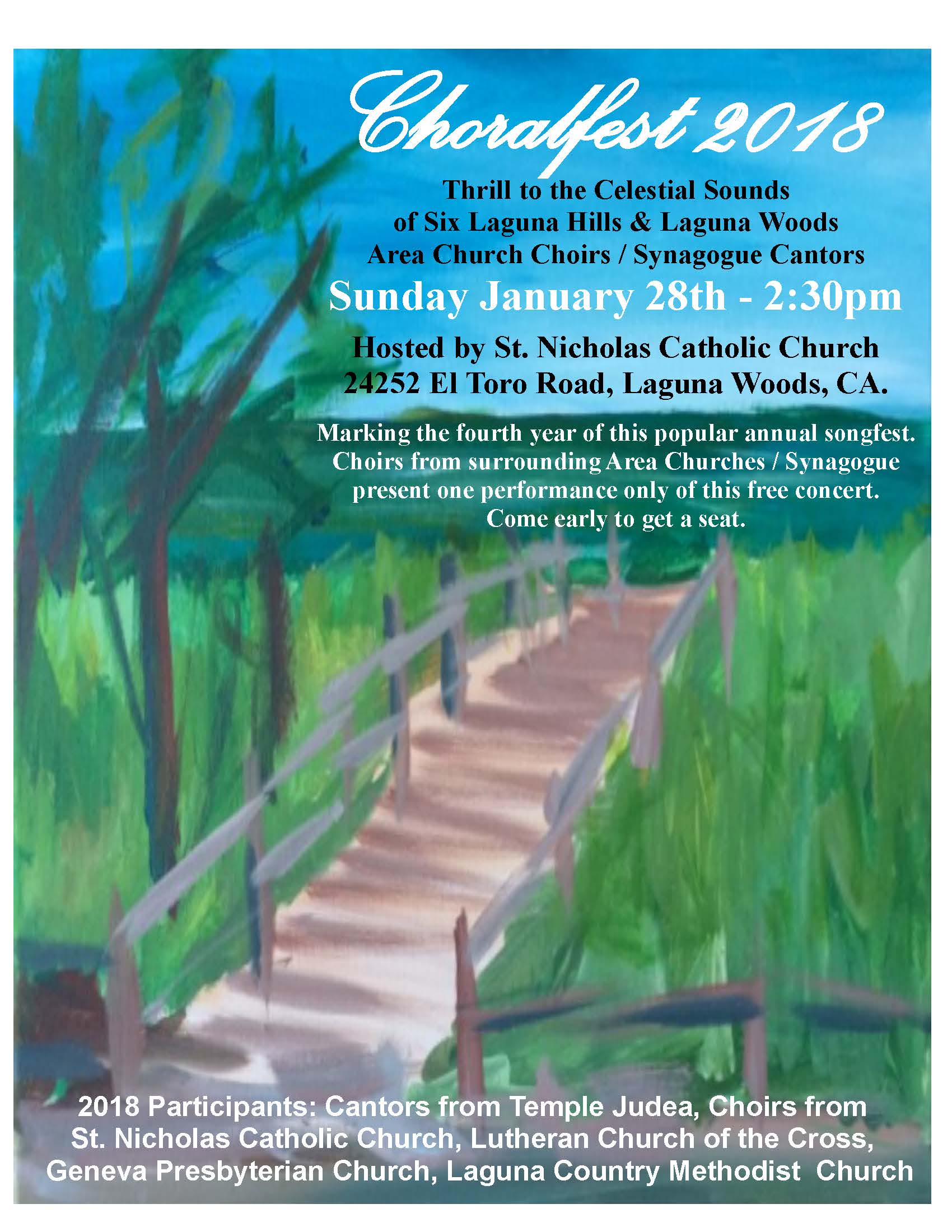 This year’s program will include Choirs and Cantors from six Laguna Hills area churches & temple in a  one performance only concert on Jan 28th at 2:30 pm at St Nicholas Church.