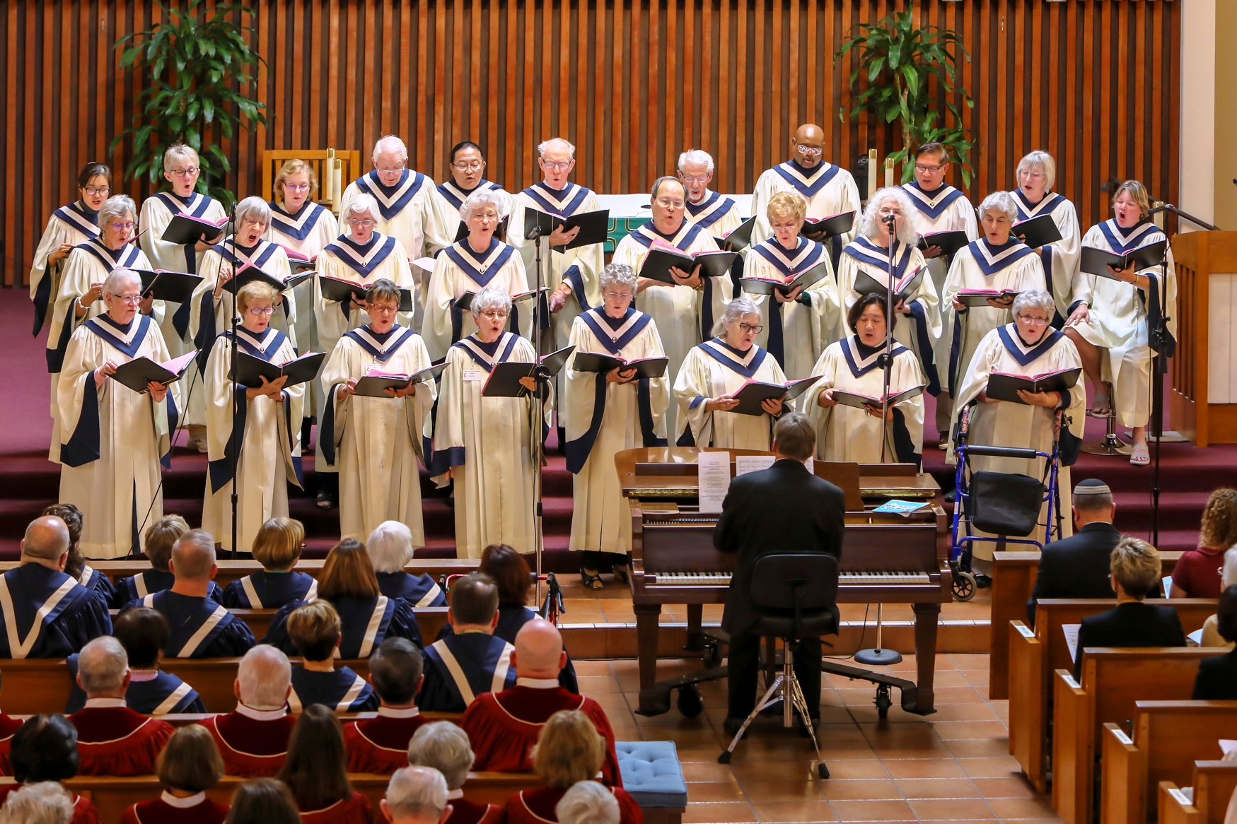 The program closed with the combined choirs and guests joining once again in singing a rousing rendition of “When in Our Music God is Glorified.” by Charles Villiers Stanford. “When in Our Music” is said to be the only hymn text in Christendom that explains the reasons for church music while simultaneously offering “alleluias” to God. The various stanzas deal with our humility in performance, the aesthetics of musical worship, and the history of church music. The final two stanzas present a biblical model and quote Psalm 150. The song ended to a thunderous applause from all in attendance. A reception in the Church’s Sporrer Hall followed the program. It was a fitting ending to the wonderful afternoon as performers and guests representing the sharing religions enjoyed their friendship and commonness in their music and love of God.