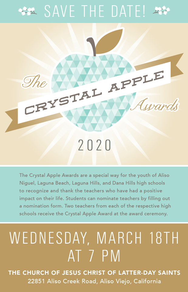 The Crystal Apple Awards ceremony will be held on Wednesday, March 18th at 7 PM at the Laguna Niguel Stake Center.