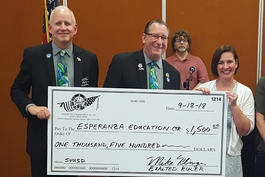 The Mission Viejo Saddleback Valley (MVSV) Elks Lodge #2444 proudly presented a donation of $1,500 to the Esperanza Educational Center; a special needs school in the Saddleback Valley Unified School District.