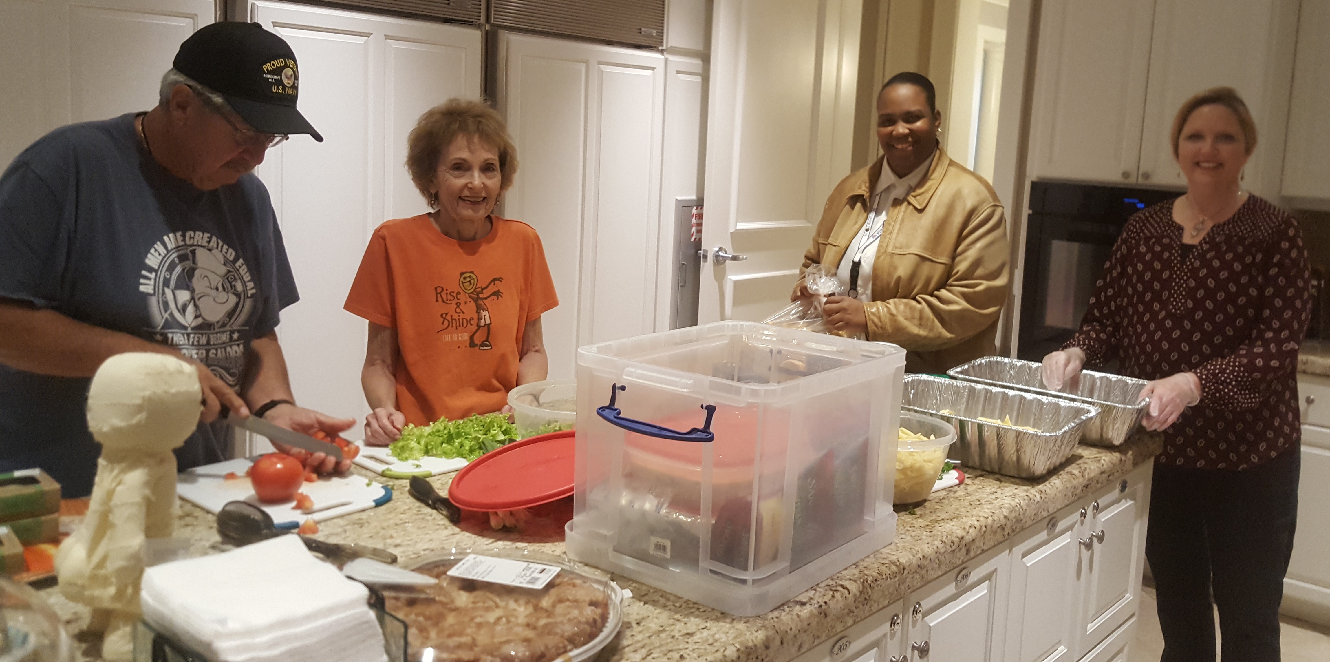 On October 22, a four-person Elks Veterans Committee Team from the Mission Viejo, Saddleback Valley Elks, visited the Fisher House near the Long Beach Veterans Hospital (VA) and prepared a meal for 13 residents. Ms. Chi Austin, Fisher House Program Support Assistant, met with the Elks Team and explained the Fisher House had recently received many donations of blankets and toys. Katie Muir prepared her now famous and scrumptious Chicken “ELK-fredo” Casserole and Sheryn Howlett and Lucky Walch prepared a hearty mixed salad. Vets Committee Chairman Jerrie Muir washed the dishes! Residents were treated to a dessert of apple pie and whipped cream.