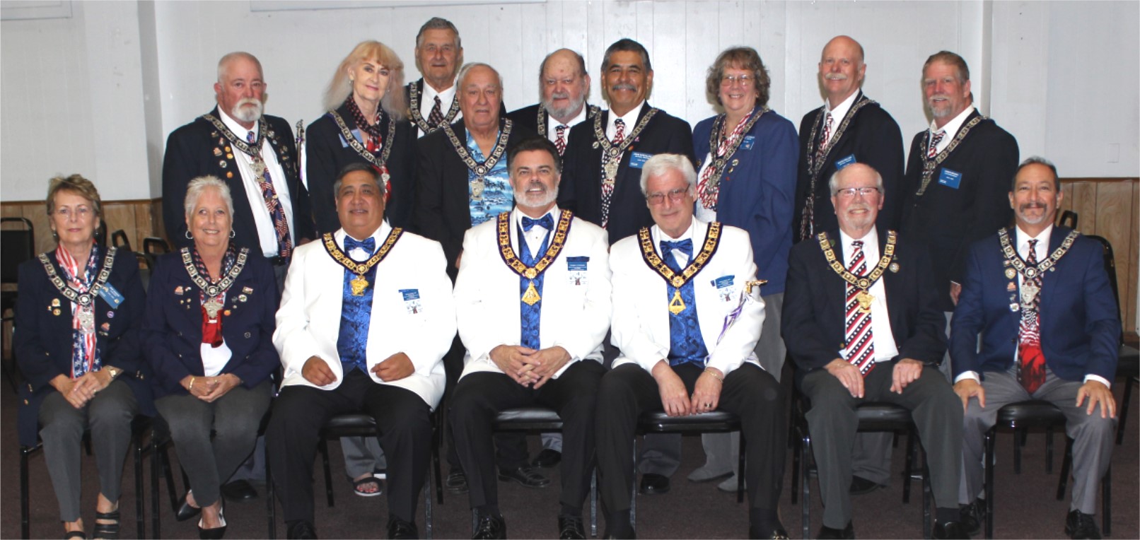 Seated: Pat Fusco-Chaplain, Pam Roosevelt-Loyal Knight, Oscar Garza-Auditor and PER Orange Lodge, Scott Stephens-DDGER, Fullerton Lodge,  Jon Ellowitz Esquire to the DDGER, Newport Harbor Lodge, Phil Covey-Exalted Ruler, Jack Ray-Leading Knight, Standing: Richard Crowe-Esquire, Laulene Foster-Tiler, Lonnie Baldridge-Secretary, Ron Custard-Inner Guard, Ron MacDonald-Treasurer, John Castillas-Trustee, Michelle Striley-Trustee, Wayne Rollins-COB and Trustee, James Brown-Lecturing Knight from Buena Park Elks Lodge.