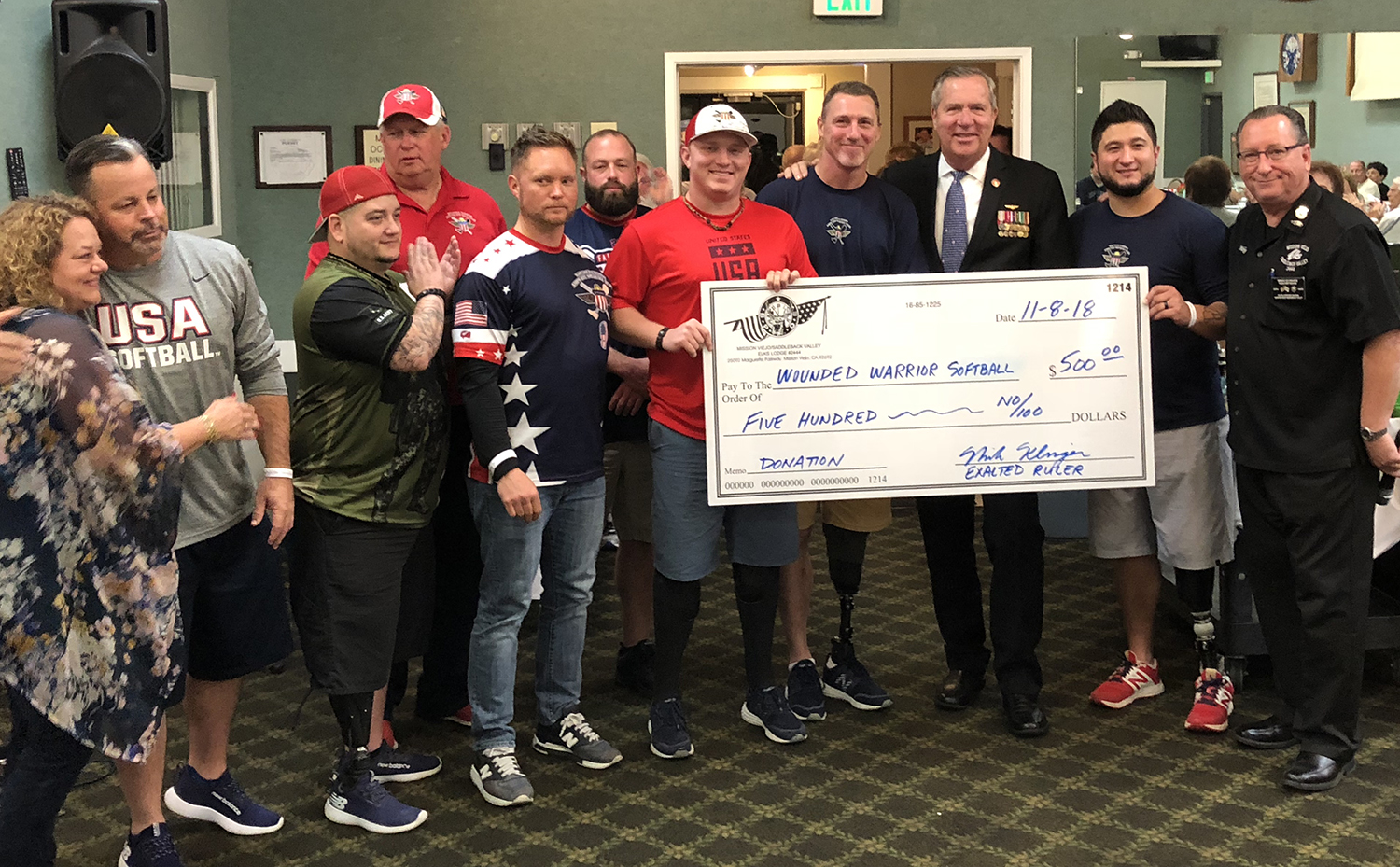 Last week the Mission Viejo Saddleback Valley Elks hosted a very special group for dinner, the Wounded Warrior Amputee Softball team. The team is in Southern California and chose the Elks lodge to spend their evening. Multiple dignitaries from Mission Viejo City Council attended including Mayor Pro Tem Greg Raths, council members Patricia Kelley and Wendy Bucknum along with Mark Nix, Director of Recreation and Community Services. Exalted Ruler Mike Klinger presented a donation from the Elks Lodge of $500 to WWAST to continue their own charitable ways. Thanks to Sheryn Howlett and others of the Mission Viejo Elks Veterans Committee for organizing this great event.