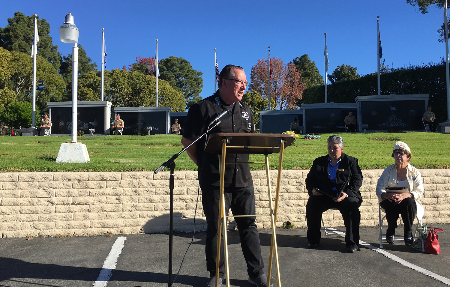 The Mission Viejo Elks, gathered support from the Veterans Committee, chaired by Jerrie Muir along with Charity Bingo, and donated $2,000 or 120 wreaths for the ceremony. For three consecutive years, Orange Elks Coast District National Veterans Service Chairman, Dave Perry, organized the Elks effort to support our community and honor our fallen heroes. Following the welcome address delivered by Pacific View Location Manager Marie Hess, a Gold Star Wife spoke about her husband’s career in the military along with her entire family of veterans.
