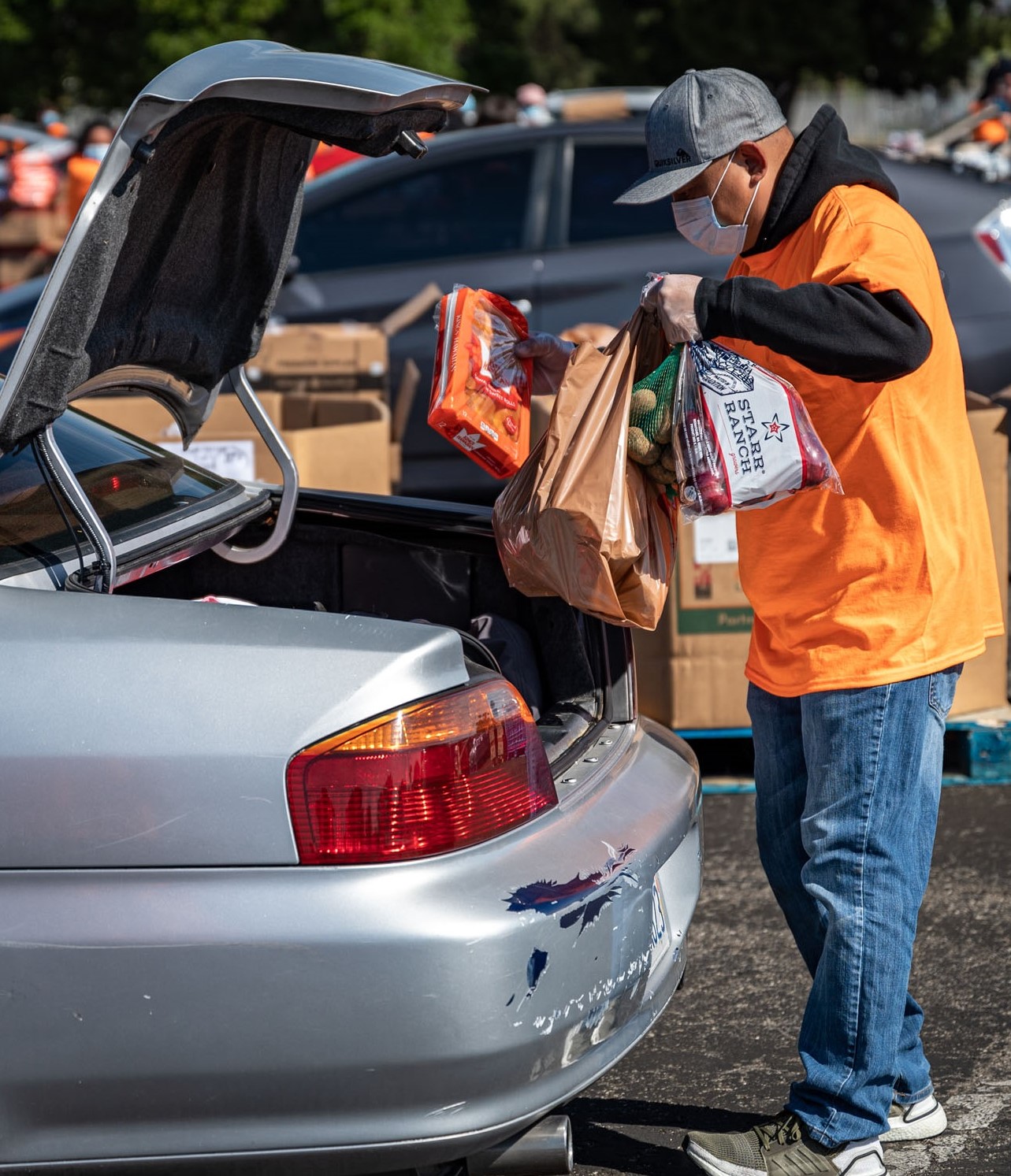 A volunteer fills the trunk of one of the 1,200 vehicles waiting in line