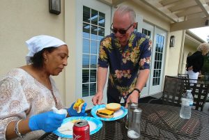 On June 18 as seven volunteers from the Mission Viejo, Saddleback Valley Elks Lodge headed towards Camp Pendleton, all looking forward to preparing their very first lunch at Fisher House. Upon arrival, they were warmly welcomed by General Manager, Victoria Powell-Johnson, who couldn’t be happier to have the group of Elks there. The group was told they were the only Elks Lodge to cook lunch for them, and they said they hoped there would be many more. The majority of the food was supplied by Georgia Kelley, owner of Mollies Café in San Juan Capistrano and Sysco Food Services. Deviled Eggs were prepared by Carol Bryan, Cole Slaw by Georgia Kelley, Baked Beans by Sheryn Howlett and Potato Salad by Larry Howlett. Sven Akesson, Lloyd Bryan, and Lucky Walch did the barbequing of hamburgers and hot dogs.