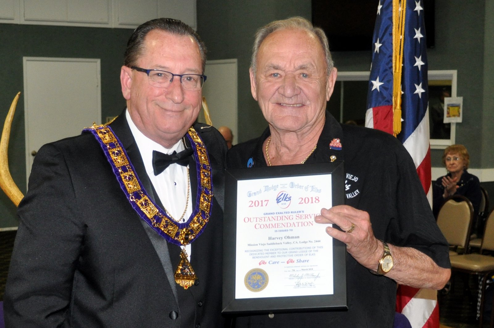 Following the initiation ceremony, a special Grand Exalted Ruler’s Award was presented by Exalted Ruler Mike Klinger to Elk member Harvey Ohman for his years of dedicated service to the Lodge. The annual award is made by the Elks National President Malcolm J. McPherson and is one of the four most prestigious honors that can be bestowed on a Lodge member. Ohman, a Mission Viejo resident, accepted the award to a standing ovation from members present.
