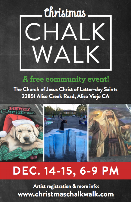 Amateur and professional artists of all ages are welcome to participate as these amazing scenes of Christmas come to life in chalk at The Church of Jesus Christ of Latter-day Saints, 22851 Aliso Creek Road, Aliso Viejo. Artist Registration is closed for this event but there is always next year!
