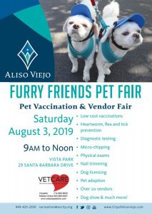Keep your furry family members happy and healthy by taking them to our annual Furry Friends Pet Fair with vaccinations and vendors from 9 am to Noon Saturday, August 3 at Vista Park next to the Aliso Viejo Aquatic Center, 29 Santa Barbara Drive!