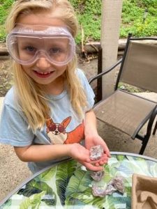 Girl Scout Daisy Abigail from Troop 8621 opens geodes with her dad to see crystals inside
