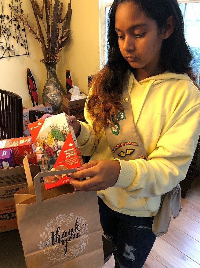Girl Scout Zaleeya D. packing Girl Scout cookies into a self-care kit