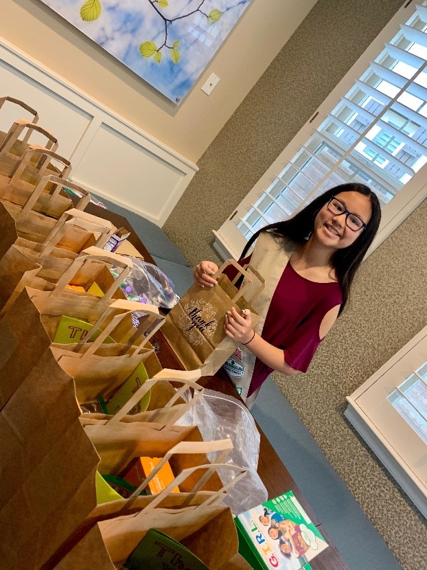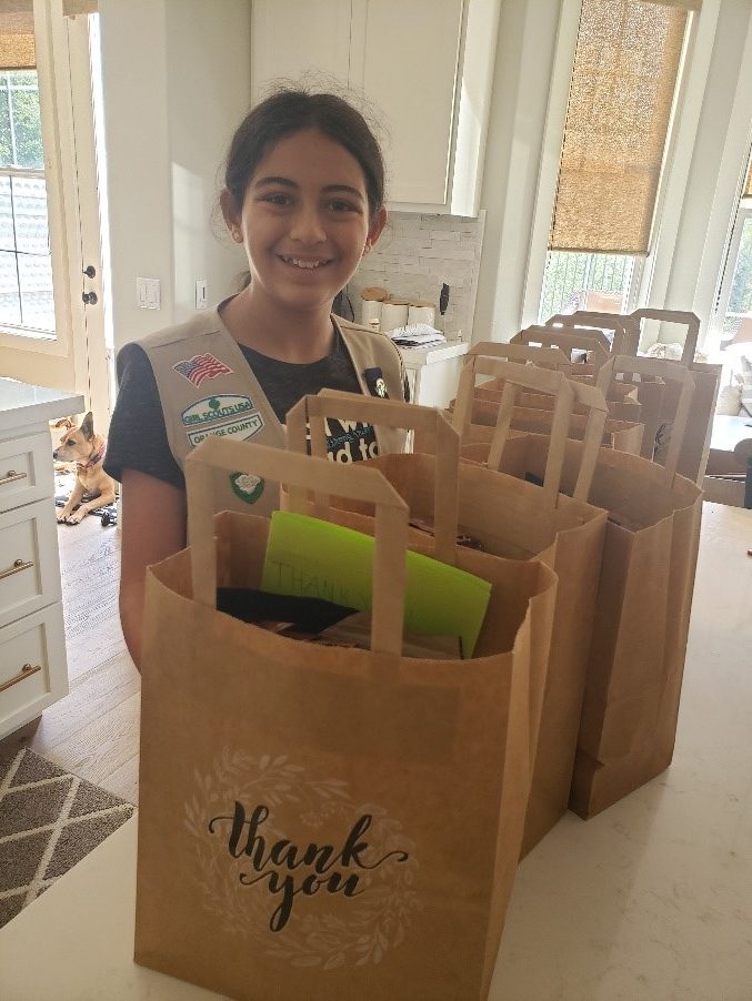 Girl Scout Zoe X. with self-care kits ready to be delivered