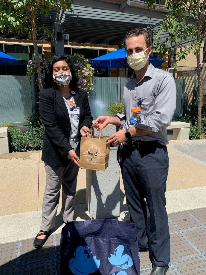 Medical workers smile after receiving self-care kits from Troop 3743