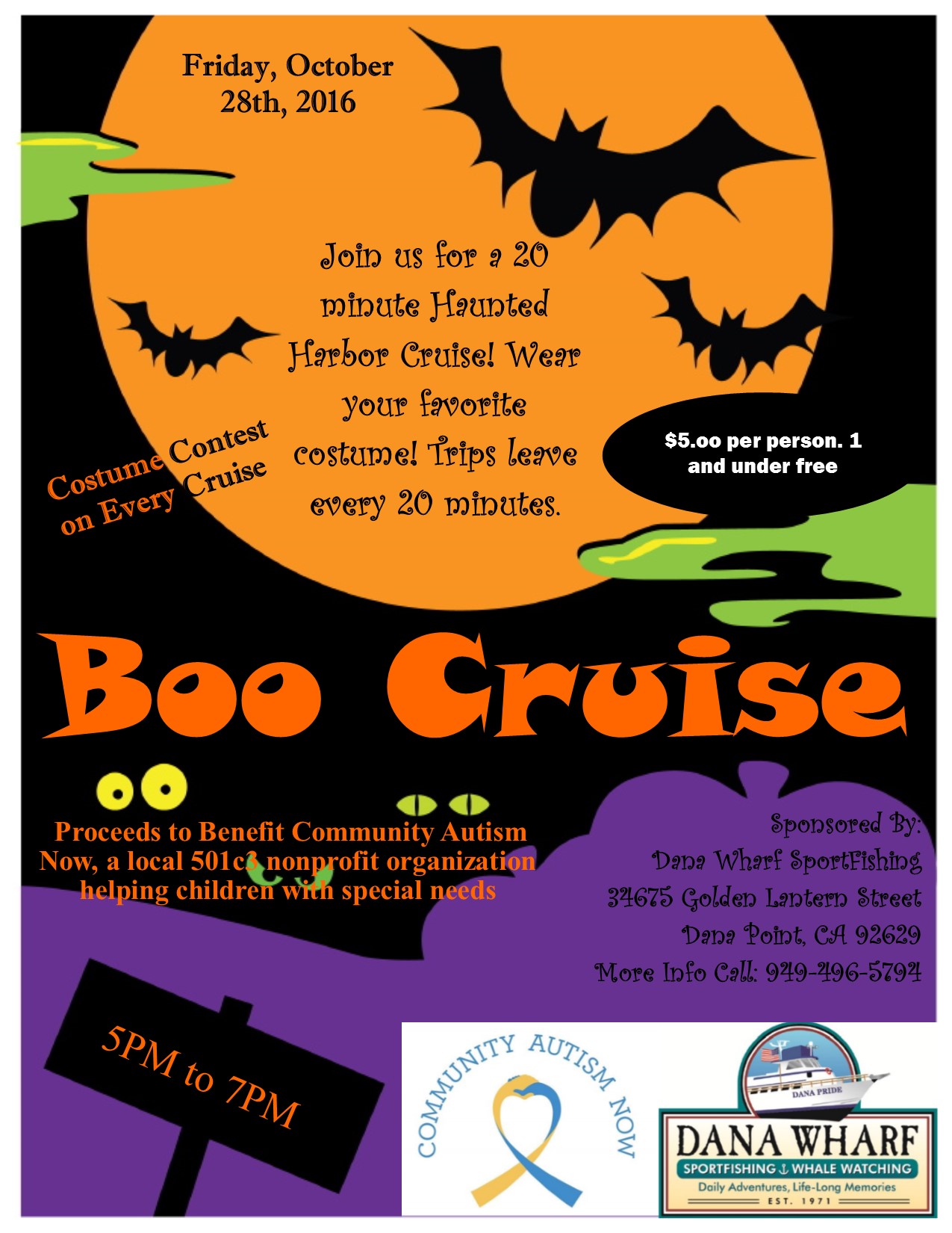Join us for a haunted 20 minute harbor cruise! Wear your favorite costume! Trips leave every 20 minutes!