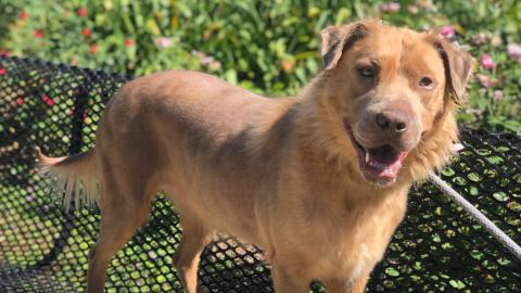 Meet Kuri, a 6-year-old mixed-breed dog. She is likely a retriever mixed with Shar-Pei or chow, but her personality is all retriever. She is fun, active and loves meeting new people and seems to enjoy other dogs. She was rescued from the El Dorado fire area when our crew was asked to help empty their kennels for evacuees from the fire.