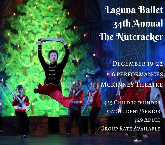 NewsThe Arts Laguna Ballet’s The Nutcracker By: Susan Keysor Espenschied Date: December 19, 2019 Thursday, December 19, 7:00 PM Friday, December 20, 7:00 PM Saturday, December 21, 2:00 PM & 7:00 PM Sunday, December 22, 1:00 PM & 6:00 PM McKinney Theatre at Saddleback College BUY TICKETS NOW! Previous articleDana Point Harbor Extends“Happy Harbor Days” Light Display Through January 5Next article ARSENIC AND OLD LACE At LA MIRADA THEATRE Susan Keysor Espenschiedhttps://alisolagunanews.whatisyourverse.com Look! Drink, Mommy! Marketing Help Free Bible Local Sponsors Popular July Brings 8 New Members into the Club 3-Day BBQ Music Festival, Carnival in Mission Viejo this weekend features military and presale online discounts Laguna Art Museum Presents Silence and Solitude: Conrad Buff and The Landscapes of the American Southwest Metropolitan Theatres Celebrates Families with Metro Summer Kids Movies Bringing Family Favorites On-Screen at MetroLux Theatres + IMAX at Outlets at San Clemente THE NEW “PERIL” AT THE LAGUNA PLAYHOUSE IN LAGUNA BEACH More like thisRelated July Brings 8 New Members into the Club Editor - August 3, 2025 The Mission Viejo-Saddleback Valley Elks Lodge #2444 located in... 3-Day BBQ Music Festival, Carnival in Mission Viejo this weekend features military and presale online discounts Editor - July 25, 2025 3-Day BBQ Music Festival, Carnival in Mission Viejo this... Laguna Art Museum Presents Silence and Solitude: Conrad Buff and The Landscapes of the American Southwest Editor - June 23, 2025 On View September 20, 2025 - January 25, 2026 Laguna... Metropolitan Theatres Celebrates Families with Metro Summer Kids Movies Bringing Family Favorites On-Screen at MetroLux Theatres + IMAX at Outlets at San Clemente Editor - June 15, 2025 Metropolitan Theatres announces Metro Summer Kids Movies from June...