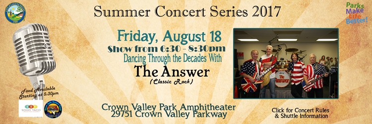 For more information visit CityofLagunaNiguel.org or call (949) 362-4351. For the safety of others… please no scooters, skateboards, rollerblades, pets, or glass containers allowed in the event area. No smoking allowed in park. Please bring low chairs/blankets. No blankets with plastic backing or plastic tarps. No chairs/blankets setup prior to park opening at 6am on concert day. The City of Laguna Niguel is not responsible for unattended items.
