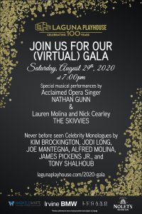Laguna Playhouse announced this week  that they will be hosting their annual gala virtually on Saturday, August, 29, 2020 starting at 7:00 pm.
