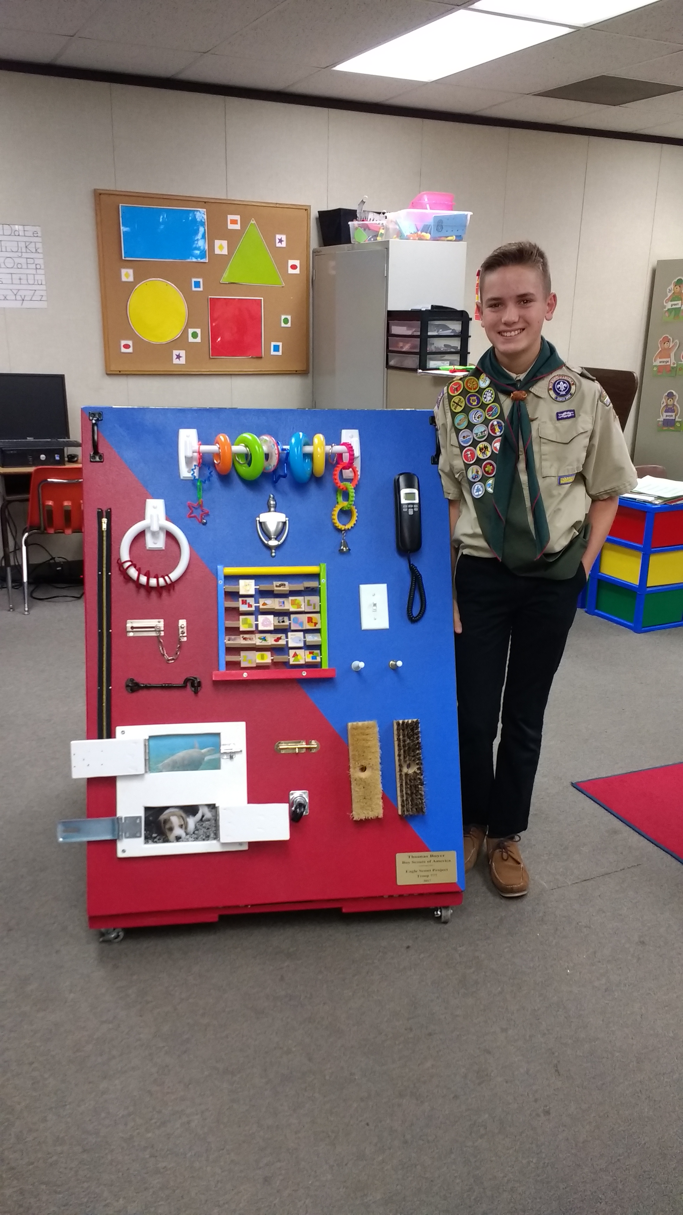 This Holiday Season thirteen-year-old Thomas Boyer of Laguna Niguel built and donated a portable sensory cart for the children of Marion Bergeson Elementary’s Autism Program for his Eagle Scout Project. He delivered it to the school on December 21st.