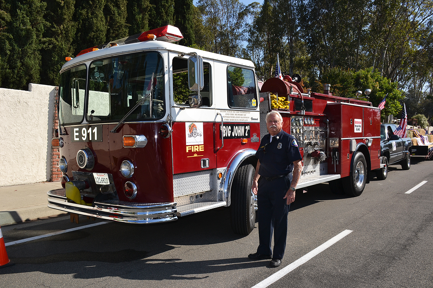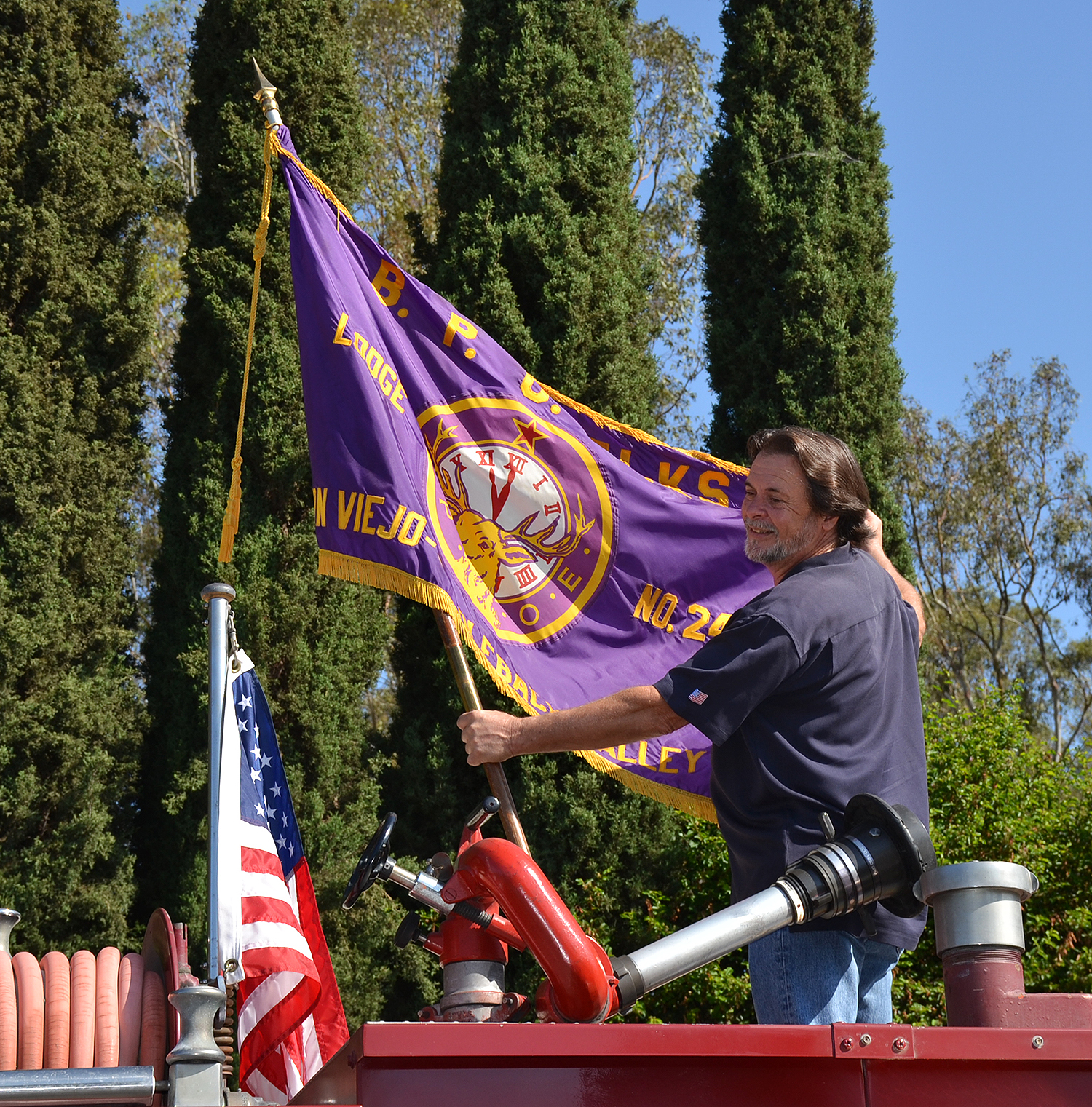 The Elks sponsored Boy Scouts from Troop 603 led the precession carrying the Elks Lodge banner and the American Flag. Past District Deputy Harvey Boelts, retired Laguna Beach Fire Captain, drove the firetruck “Big John”, Leading Knight Mike Klinger towed a trailer decorated with flags and streamers with Elk members sitting atop hay bales and the Mayor of Mission Viejo, Wendy Bucknum, an Elks member, sported herself on top of lodge Trustee Basia Bills Corvette.