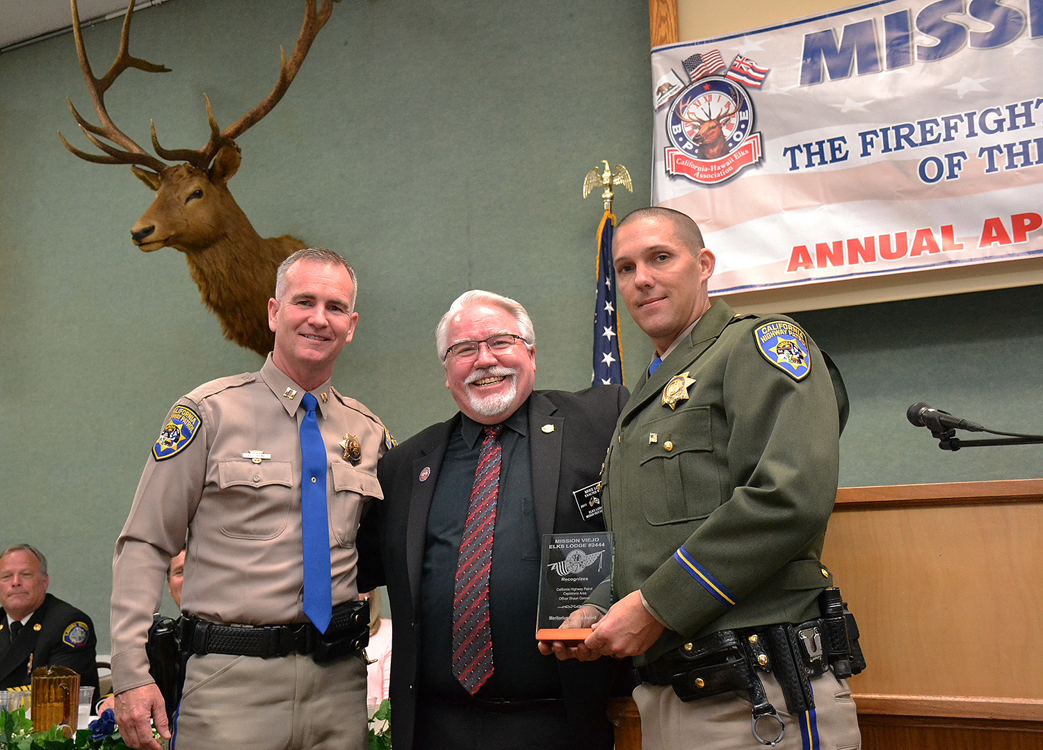 Exalted Ruler, Mike Long, Honors California Highway Patrol Officer of the Year Shaun Conner (right) with Captain Ray Diggins