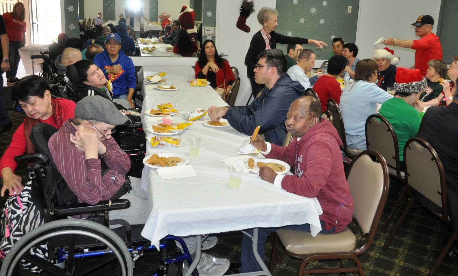 The Elks Lodge was once again full of the holiday spirit as the members played host to 150 developmentally challenged men and women from the Saddleback Valley community. The special guest ranged in age from sixteen to sixty-six. They entered the Lodge in groups – some walked, some used walkers and many came in wheelchairs.