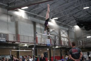 All Around Champion, Holly Carter of Aliso Viejo, performs her Level 8 bar routine. (Photo credit: Henry Quan)