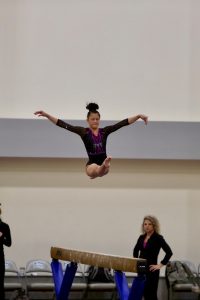 Ladera Ranch resident, Sarah Quan, leaps her way to the Level 9 gold medal on beam with a score of 9.525. (Photo credit: Henry Quan)