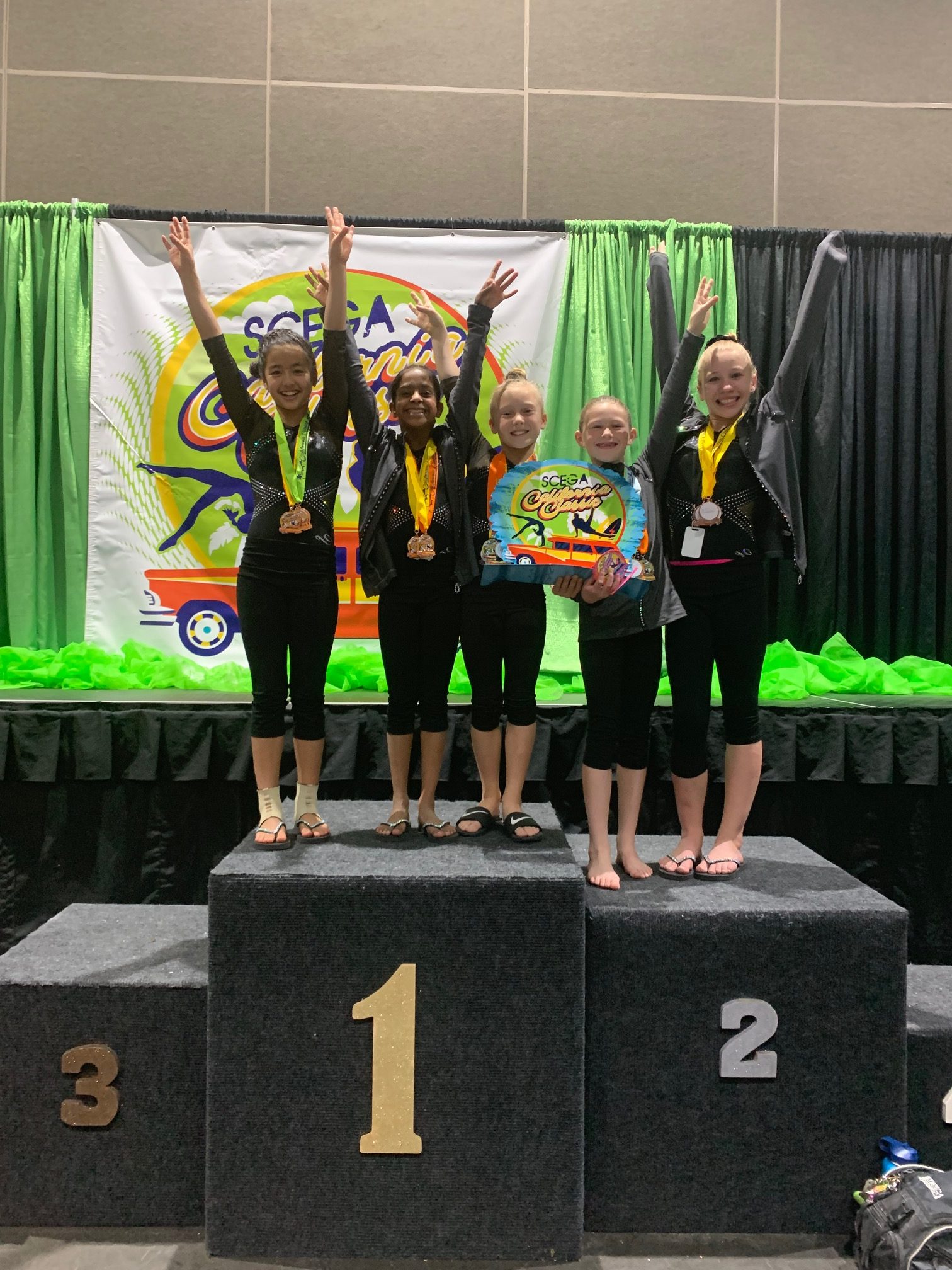 First place Level 6 team from Olympica.  Pictured left to right:  Addison Malue, Bela Block, Audrey Jackson, Kylie Phillips, and Lucy Mock. (Photo credit: Reshma Block)