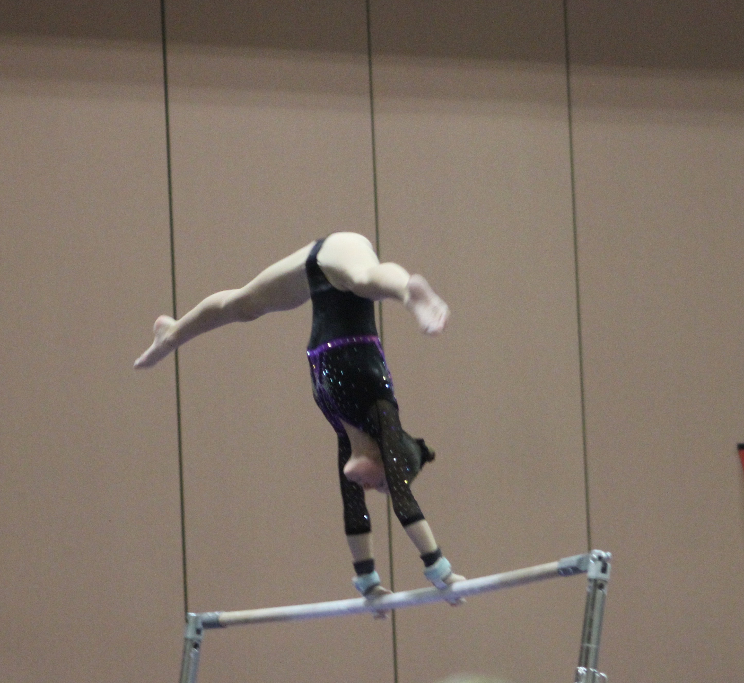 Laguna Niguel’s Kylie Phillips performs her silver medal bar routine, earning a 9.475 at the Palm Springs Gymnastics Cup. (Photo credit: Susie Phillips)