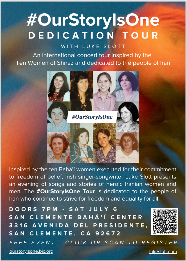 The #OurStoryIsOne Tour honors the 40th anniversary of the execution, in 1983, of ten Bahá’í women – members of Iran’s largest religious minority – for their commitment to freedom of belief. Details and tour dates at lukeslott.com
