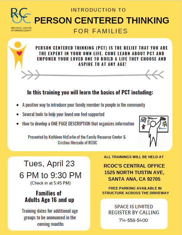 | Person-Centered Thinking is a new approach that is influencing all services provided by Regional Center of Orange County. All RCOC employees and many of the vendors have been trained in this approach.