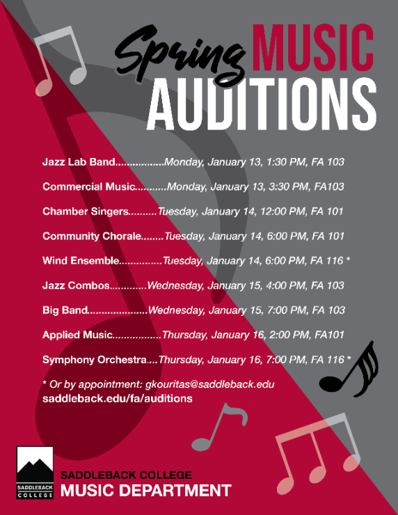 Saddleback College – Music Auditions! – Jan. 13-16, 2020