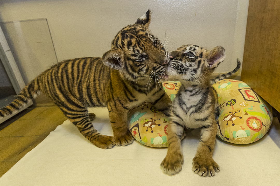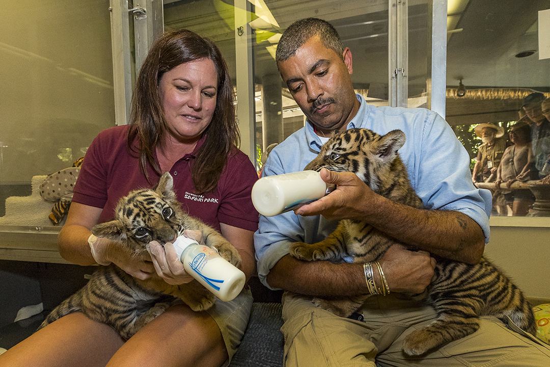 The cubs took to each other immediately, and interacted by wrestling, jumping and engaging in a lot of friendly roughhousing—things tiger cubs do. Keepers will keep a close on eye on the cubs for 24 hours, and if all goes well, guests at the Safari Park will be able to see them through the nursery window at the Animal Care Center tomorrow from 9 a.m. to 5 p.m.