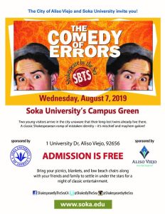 Join the City of Aliso Viejo and Soka University for a free evening of Shakespeare Under the Stars as they present Shakespeare by the Sea’s production of The Comedy of Errors.