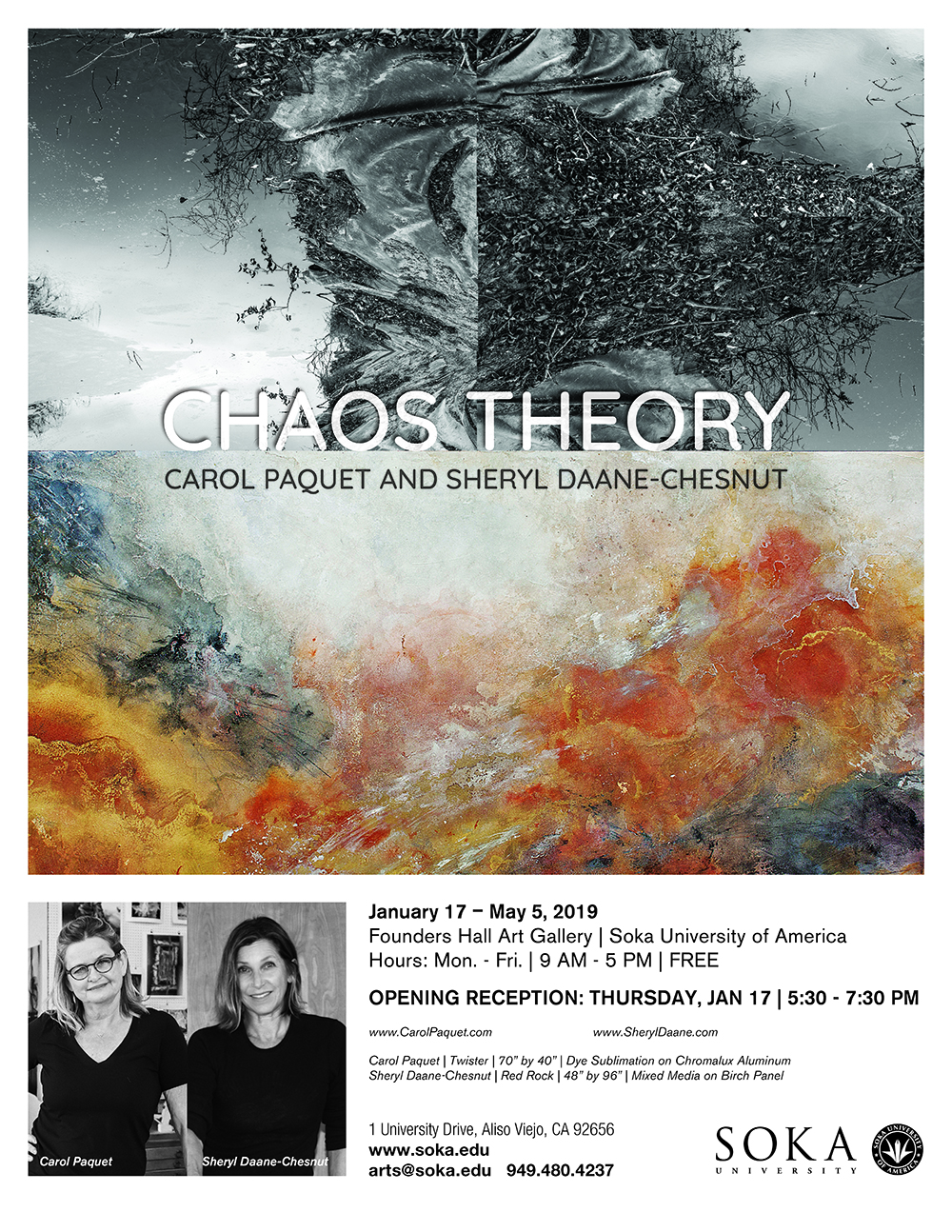 Chaos Theory: Carol Paquet and Sheryl Daane-Chesnut is a body of work, which engages the unpredictability and conversely, order in nature. Behind the veil of apparent randomness, many of nature’s processes are highly ordered, following simple rules. Daane-Chesnut and Paquet use nature as a point of departure but the similarity between their processes stops there. Daane-Chesnut physically alters the surface of her paintings, whereas Paquet looks for disparate properties existing in the source material and then mines the image until the content is loosened from its frame of reference. The intuitive and sometimes volatile quality of Daane’s work complements Paquet’s more introspective ad grace interpretation of everyday abstractions. Both artists speak to the indiscrimination of their subject matter: one artist gives more tenure to chance and the other endeavors to harness the accidental and create a semblance of order and structure.