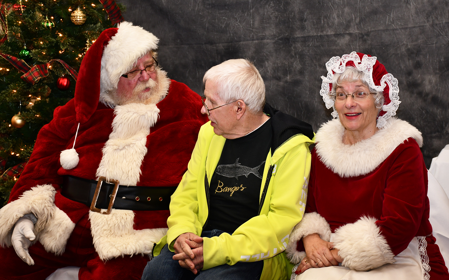 Santa and Mrs. Claus entered the Lodge to cheers and worked their way through the crowded dance floor with many hugs and warm greetings for all before retreating to a special room to make ready for the individual visits. Each guest enjoyed his or her own personal time with Santa and received a bag full of gifts and a photo taken with Santa and Mrs. Claus.