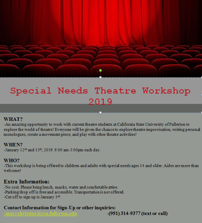 She has organized the following 2-day workshop which will be overseen by CSUF faculty with other CSUF students volunteering. Each participant is allowed an aide, so if you think you or your family member could participate best with 1:1 assistance, an aide can accompany the person enrolling.