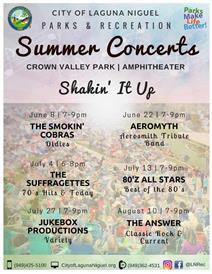 Bring your family and friends to enjoy a night of music under the stars! Free shuttle service available for every concert from 6:15-9: 45 pm. Park at City Hall at 30111 Crown Valley Parkway. Food and dessert will be available for purchase from gourmet food trucks. Food trucks available this concert series will be Soho Taco and The Cut – Handcrafted Burgers.