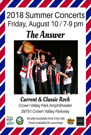 Bring your family and friends to enjoy a night of music under the stars! Free shuttle service available from 6:15 – 9:45 pm. Park at City Hall at 30111 Crown Valley Parkway. Food and dessert will be available for purchase from gourmet food trucks. For more information call (949) 425-5100. For the safety of others: please no scooters, skateboards, rollerblades, pets, or glass containers allowed in the event area. No smoking allowed in the park. Please bring low chairs/blankets. No blankets with plastic backing or plastic tarps. No chairs/blankets setup prior to park opening at 6 am on concert day. The City of Laguna Niguel is not responsible for unattended items.
