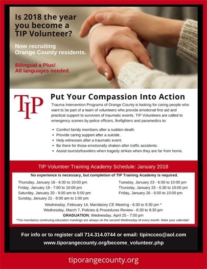 TIP (Trauma Intervention Program) is a group of specially trained volunteers who provide emotional aid and practical support to victims of traumatic events and their families in the first few hours following a tragedy.
