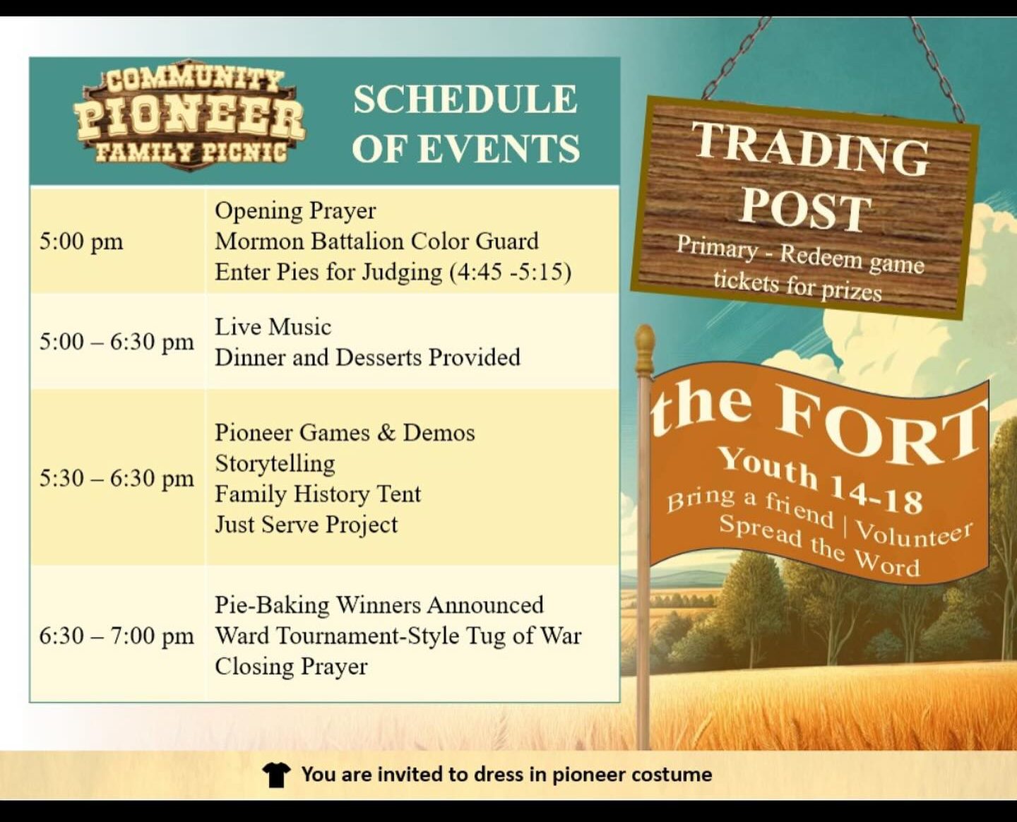 Shared games, activities, food, and service projects create bonding experiences and friendships in our diverse community.  Everyone is welcome to join us to commemorate the pioneers who persevered to establish a western frontier to live freely and worship God according to the dictates of one’s conscience.