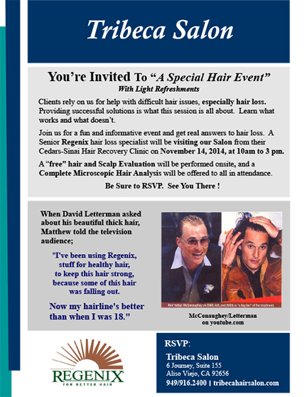 Cedars-Sinai Hair Recovery Clinic on November 14, 2014, at 10am to 3 pm. A “free” hair and Scalp Evaluation will be performed onsite, and a Complete Microscopic Hair Analysis will be offered to all in attendance. Be Sure to RSVP. See You There!