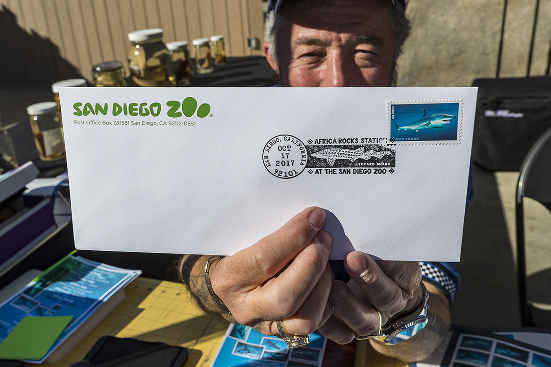 This ceremony kicked off a daylong pictorial cancellation opportunity at the San Diego Zoo promoting the sale of the USPS Sharks Forever stamps featuring five species of shark that inhabit American waters.